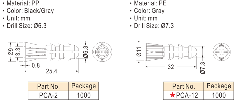 PCA-2、PCA-12 Plastic Conical Anchor 膨脹螺絲 塑膠壁虎